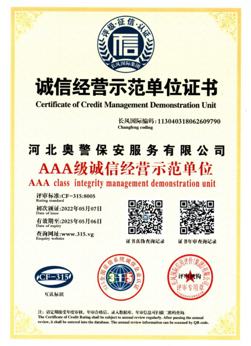 奧警邯鄲保安公司是一家民營保安服務(wù)公司,工商行政管理局登記注冊(cè),獲取相關(guān)等級(jí)資質(zhì)證書,是一家大型的保安連鎖服務(wù)公司。